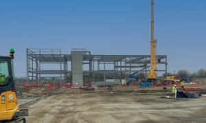 The steel frame is well underway at Wilson Bowden Developments' Sustainable Materials and Manufacturing Centre.
